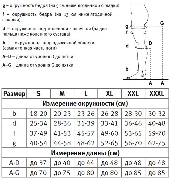 - Физиологически распределенная градуированная компрессия лодыжка 100%, середина икры 80%, колено 50-60%, верхняя треть бедра 20-30%;