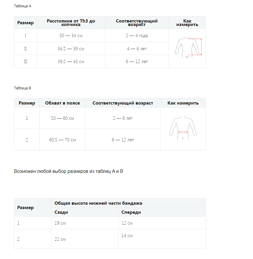 Есть возможность комплектовать разные размеры из таблицы А и В. Для точной подгонки размера бандажа есть возможность выбора высоты поясничного пояса.