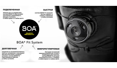 - BOA® Fit – система характеризуется тем, что застежка очень прочная, неэластичная, надежная, простая и безопасная. Если застежку не разблокировать или не сломать, то ее нельзя ослабить, что гарантирует более надежную стабилизацию чем любые другие системы фиксации