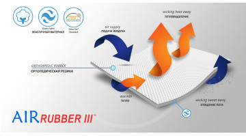 AirRubber III™ характеризуется односторонней эластичностью. Материал растягивается в длину но не в ширину, что увеличивает компрессию. Воздух свободно циркулирует между нитей, вентилируя кожу. Кроме компрессии материал легко массирует кожу. Материал очень приятный для кожи.