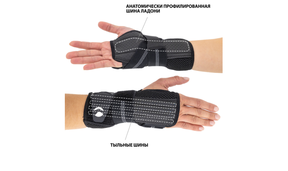 Изделие оснащено анатомически профилированной шиной фиксирующей запястье, а также лентой VELCRO, способствующей идеальному прилеганию изделия к конечности. На тыльной стороне ладони имеются четыре упругие вставки, дополнительно фиксирующие запястье.