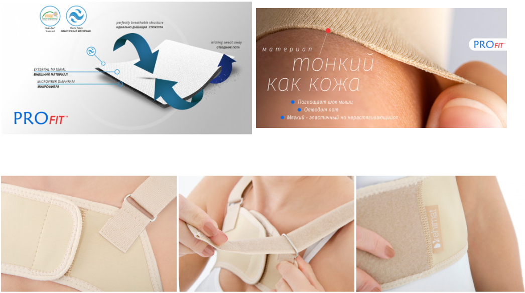 Материал гарантирует правильную компрессию и прилегание изделия к телу пациента. Обеспечивает также поддержание соответствующего микроклимата кожного покрова и эффективное отведение пота. ProFit™ безопасен для кожи пациента и имеет сертификат Oeko-TexStandard 100.